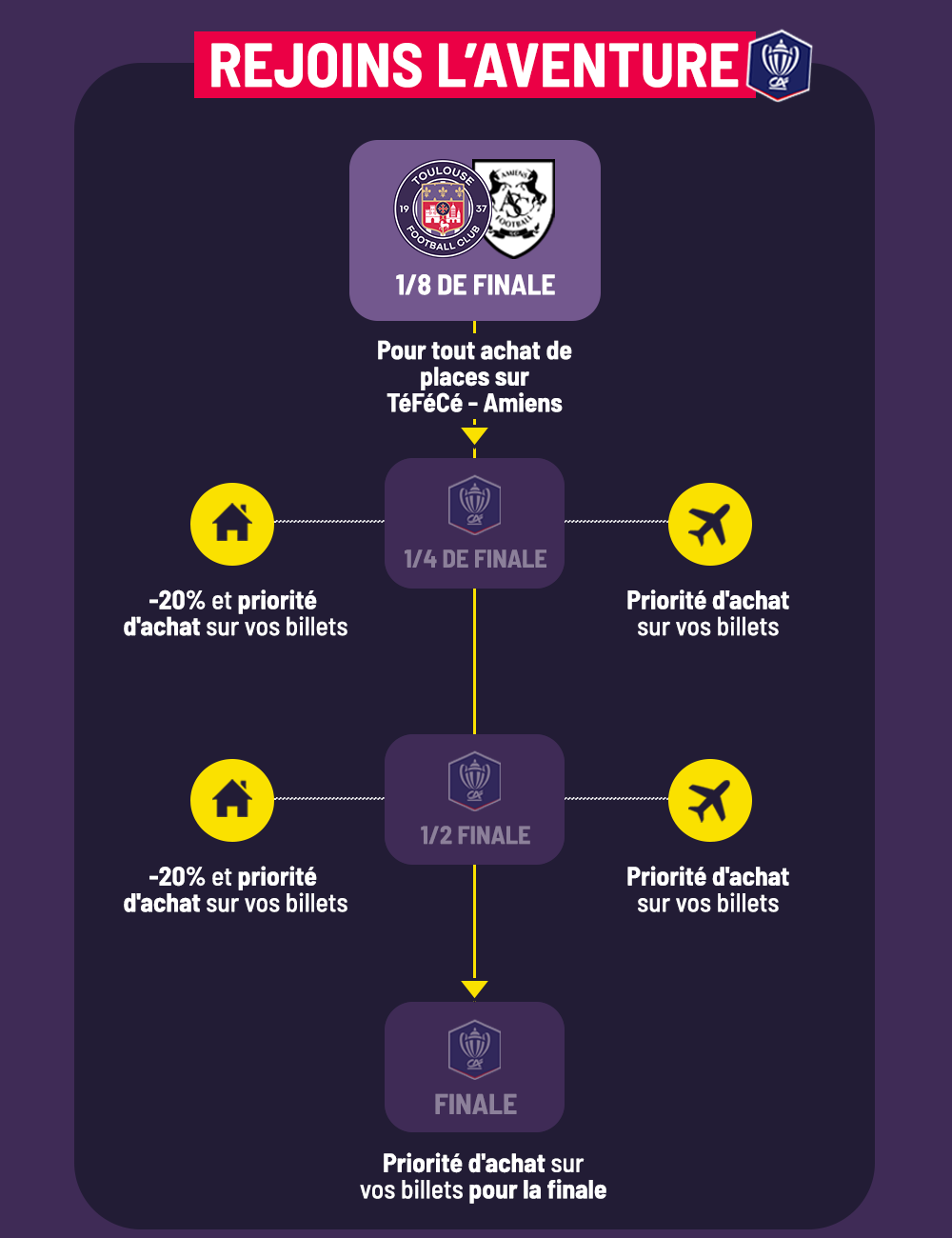 Ces avantages sont valables uniquement pour les acheteurs de billet et en cas de qualification du Toulouse FC pour le(s) prochain(s) tour(s) de Coupe de France Crédit Agricole 20026.
